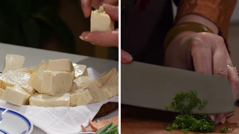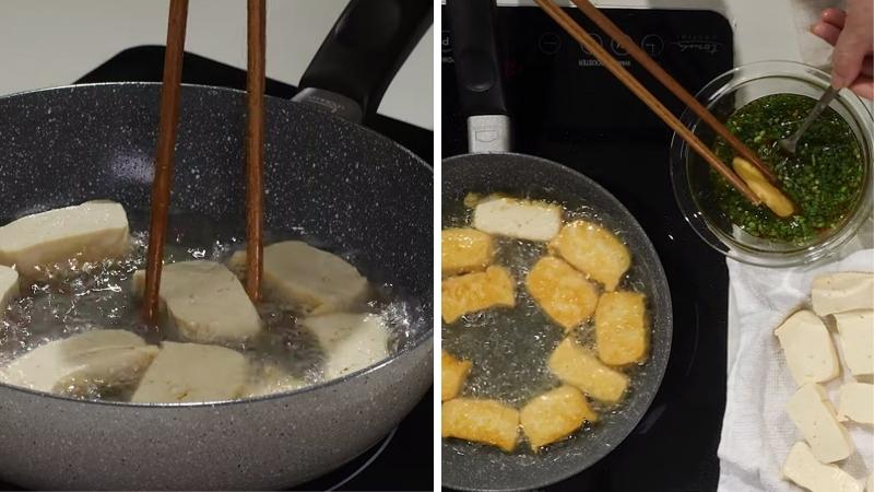 Mẹo hay: Bạn nên đặt đậu phụ lên một chiếc khăn khô để thấm bớt nước. Như vậy, khi mang đi chiên sẽ không bị bắn dầu.