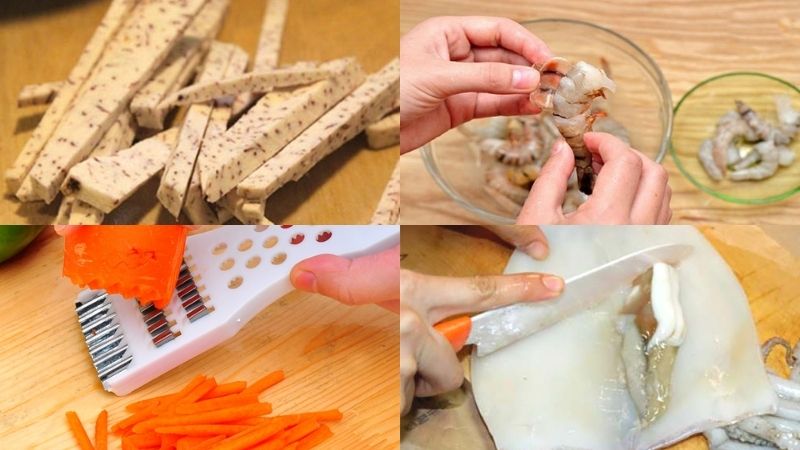 Tôm lột vỏ, lấy chỉ lưng, rửa sạch. Mực rửa sạch,khứa vảy rồng và cắt miếng vừa ăn. Húng lủi và ngò gai cắt nhỏ. Ớt sừng cắt lát