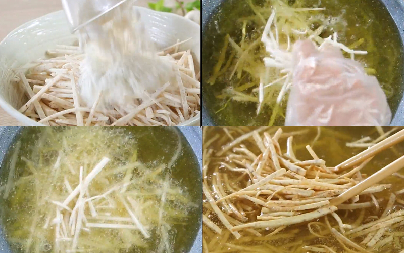 Tẩm khoai môn cắt sợi với 50g bột chiên giòn cho vào dầu nóng vừa chiên vàng giòn. Sau đó vớt ra để ráo dầu.
